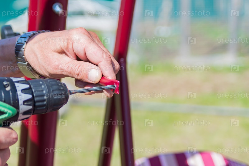 Рабочий делает отверстие в металле сверлом