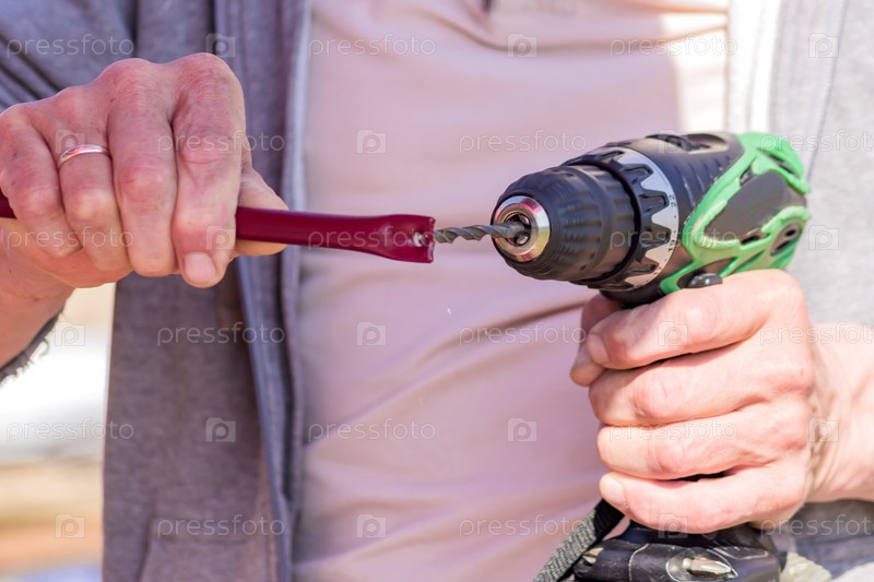 Рабочий делает отверстие в металле сверлом