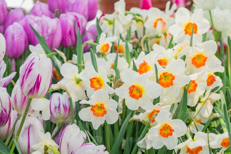 Нежный цветущий белый нарцисс и фиолетовые цветы тюльпана в весеннем саду