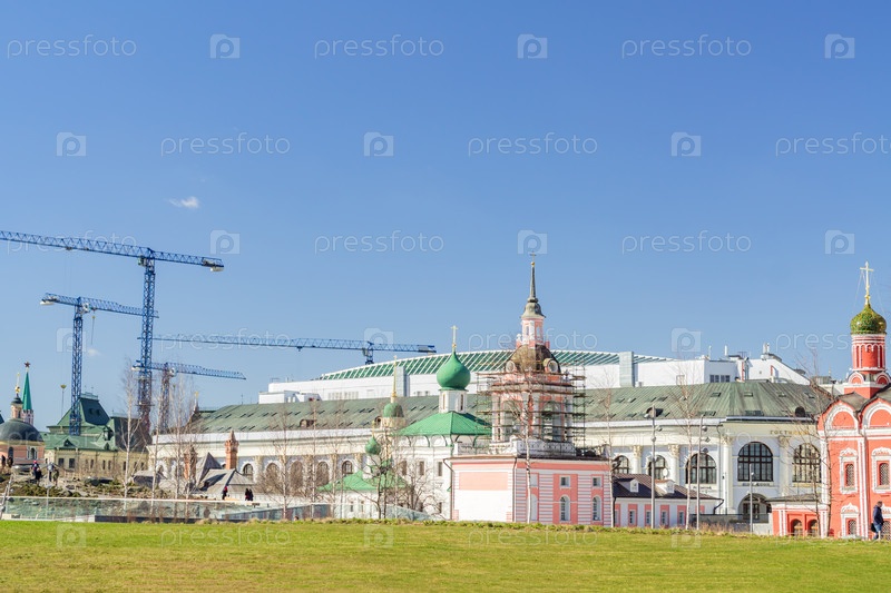 Москва, Россия - 11 апреля 2018 г.: Вид на город из парка "Зарядье", строящиеся церкви и здания, ремонт Москвы