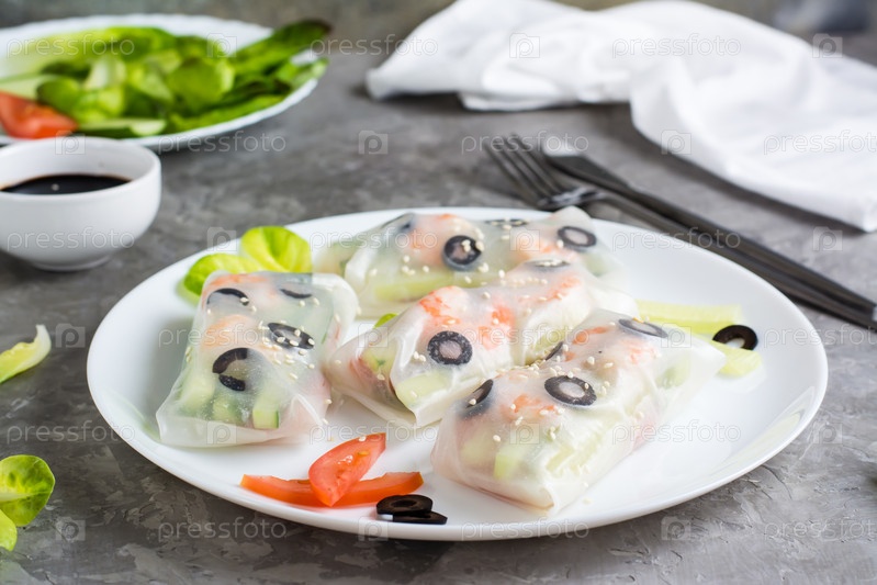 Свежие блинчики с начинкой в рисовой бумаге из креветок, оливок и овощей на тарелке на столе