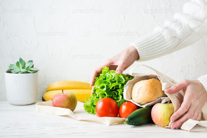 Женские руки держат набор продуктов в экологически чистой текстильной упаковке из доставки на белом столе