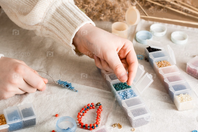 Руки девочки берут бусины из коробочки и плетут дельфина. Развитие творческих способностей и мелкой моторики у детей. Вид сверху