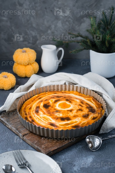 Готовый к употреблению свежий сладкий многослойный тыквенный пирог в форме на столе. Угощение на День Благодарения. Вертикальный вид