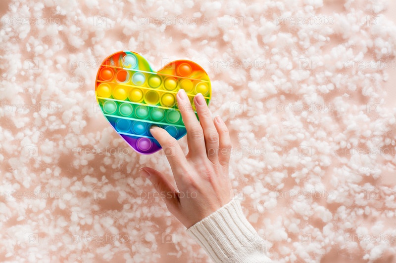 Женская рука прижимает силиконовую радужную антистрессовую игрушку на фоне пуха. Современный способ расслабиться