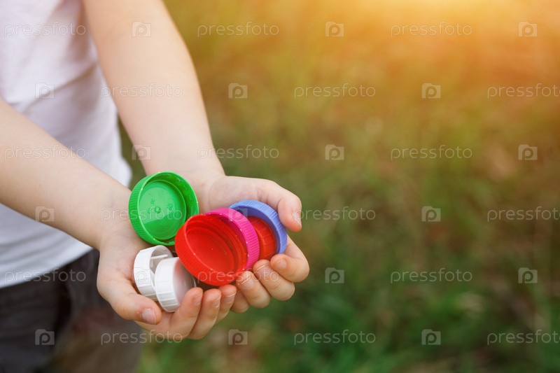 Маленькая девочка держит в руках крышки от пластиковых бутылок. Волонтерская благотворительная акция «Добрые крышки» в помощь детям-сиротам