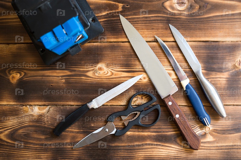 Заточка ножа на электроточилке в домашних условиях. Расположение ножей и ножниц с точилкой на деревянном столе. Вид сверху, плоская планировка