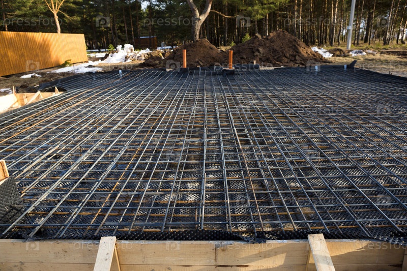 Железная арматура на деревянной отмостке с уложенными трубами является основанием для заливки фундамента дома бетонной плитой. Строительство коттеджей, проектирование, инженерные коммуникации