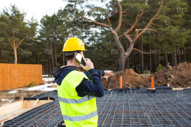 Строитель разговаривает по смартфону в желтом шлеме и защитном жилете на фоне строительства дома-армирования фундамента, труб и отмостки
