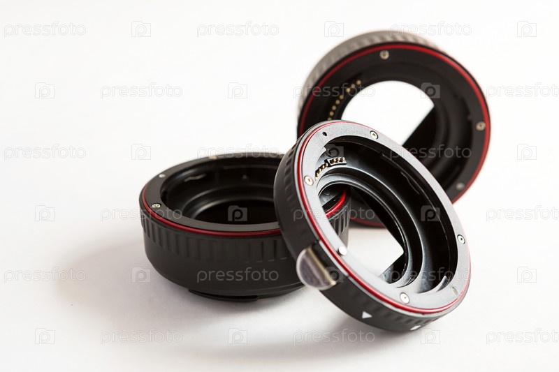 Кольца макроса для макрообъектива камеры на сером фоне. Профессиональная макросъемка, дополнительные возможности, пластиковые кольца с чипом. Три кольца разного размера с разным фокусным расстоянием