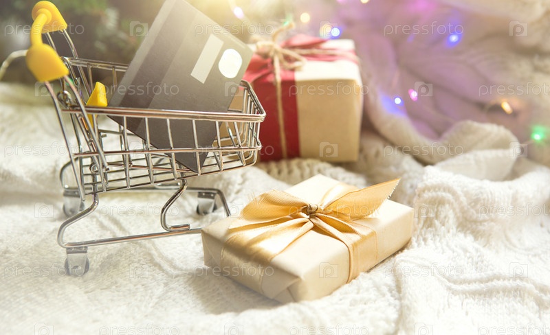 Коробка с подарком в рождественской упаковке в корзине на белом вязаном одеяле. Черная пятница, покупка подарков на новый год. Праздничный декор, Банковская пластиковая карта - безнал, интернет-магазин. Копировать пространство