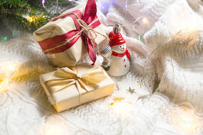 Коробки с рождественскими подарками и украшениями Снеговик на белом вязаном одеяле в огнях гирлянд и еловых ветвей. Новый год, праздничная атмосфера. Место для текста
