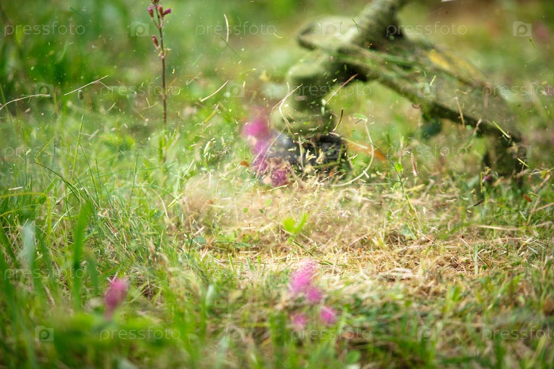 Тример косит траву крупным планом. Леска в движении и частицы травы в воздухе. Уход за газоном и придомовой территорией, дачным участком, ландшафтный дизайн, флористика, сад и растениеводство. Копипространство