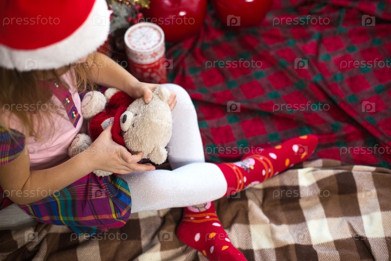 Маленькая девочка держит плюшевого мишку, сидит на пледе в рождественских украшениях возле елки с коробками подарков и шляпой Санты. Новый год, детская игра