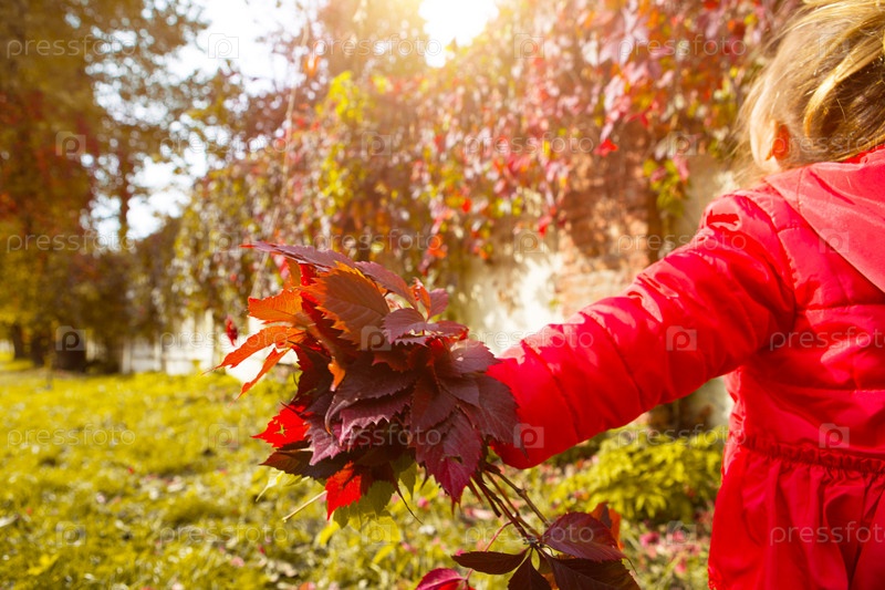 Девушка с букетом красных опавших осенних листьев наслаждается солнечной погодой. Осеннее настроение