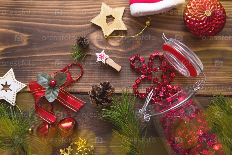 Рождественские украшения на деревянном фоне. Бусины в стеклянной банке с крышкой, звезды, шапка Санты, шишки, сосновые ветки. Новый год, подготовка к празднику. Место для текста