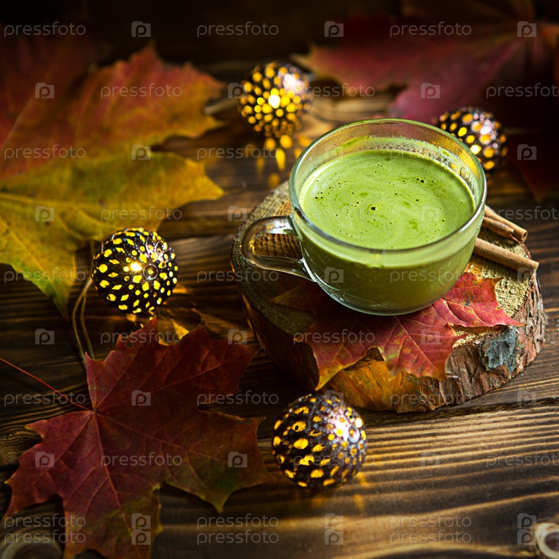 Зеленый японский чай матча с пеной в прозрачной чашке на деревянном столе в осеннем натюрморте. Теплая атмосфера и уют, гирлянды огней, красные кленовые листья, палочки корицы, тыква, печенье, ломтик
