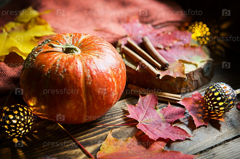 Оранжевая натуральная круглая тыква на деревянном столе с опавшими желтыми и красными кленовыми листьями, палочками корицы. Гирлянды огней, теплая осенняя атмосфера, День благодарения, праздник урожая, Хэллоуин. Копировать пространство
