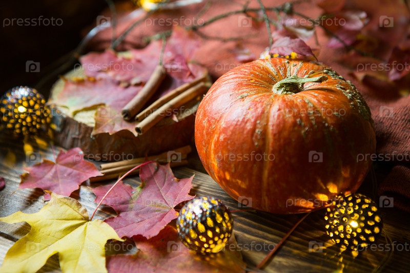 Оранжевая натуральная круглая тыква на деревянном столе с опавшими желтыми и красными кленовыми листьями, палочками корицы. Гирлянды огней, теплая осенняя атмосфера, День благодарения, праздник урожая, Хэллоуин. Копировать пространство