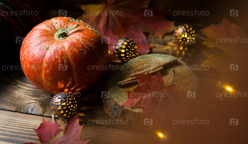 Оранжевая натуральная круглая тыква на деревянном столе с опавшими желтыми и красными кленовыми листьями, палочками корицы. Гирлянды огней, теплая осенняя атмосфера, День благодарения, праздник урожая, Хэллоуин. Копировать пространство