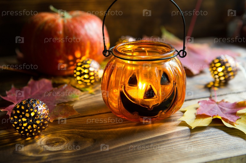 Тыква-лампа с глазами и ртом из стекла и натуральной оранжевой тыквы на деревянном столе с желтыми и красными кленовыми листьями. Хэллоуин, теплая осенняя атмосфера. Круглая гирлянда, свеча в подсвечнике