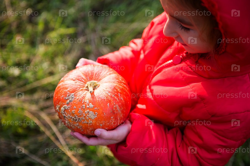 Оранжевая круглая тыква в руках маленькой кавказской девочки в ярко-красной куртке с капюшоном. Сосредоточьтесь на тыкве. Праздник урожая, День благодарения, экологически чистая еда, осенняя атмосфера, Хэллоуин