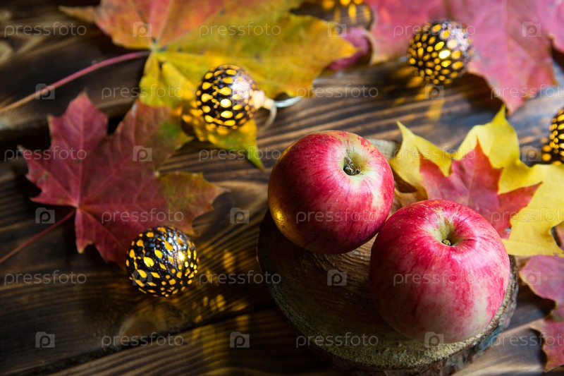 Розовые спелые яблоки на деревянном столе с опавшими желтыми и красными кленовыми листьями. Огни гирлянд, теплая и уютная осенняя атмосфера, День благодарения, праздник урожая. Копировать пространство