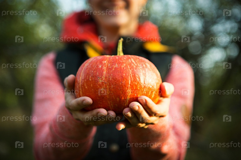 Оранжевая круглая тыква в женских руках на темно-зеленом фоне. Праздник осеннего урожая, сельское хозяйство, садоводство, День благодарения, Хэллоуин. Теплая атмосфера, натуральные продукты. Место для текста