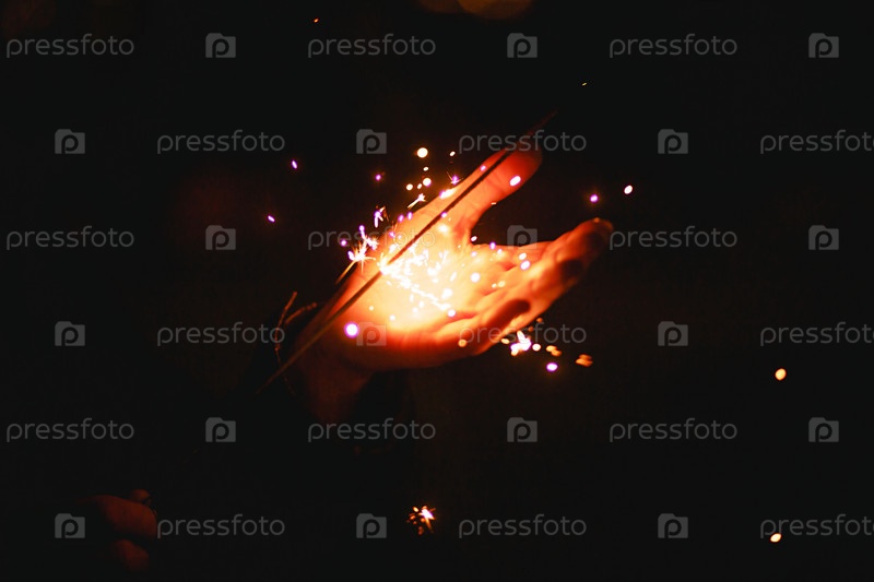 Искры и свет от бенгальских огней в темноте на ладони человека. Рождественская магия, канун Нового года, праздничный фон. Место для текста