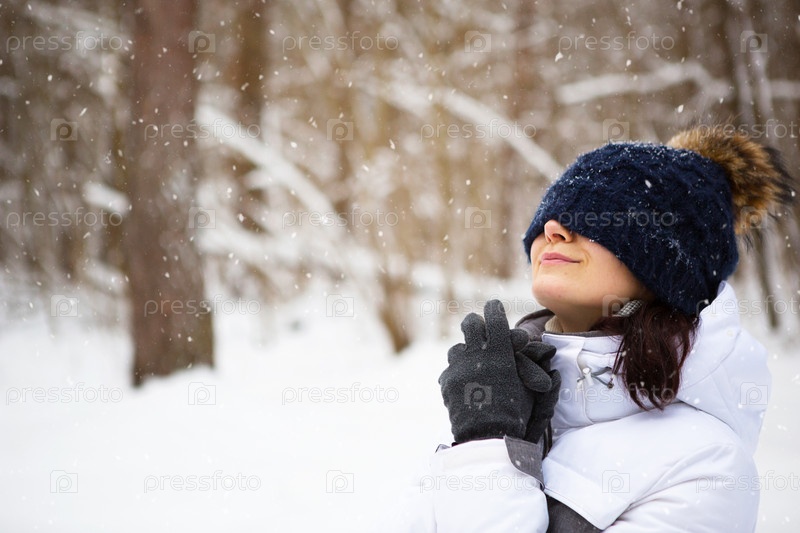 Женщина в теплой вязаной шапке, надвинутой на глаза, улыбается и наслаждается снегом, холодной погодой. Мероприятия на свежем воздухе, сезон, зима, таяние снега. Покрытый инеем, красивая улыбка. Портрет крупным планом