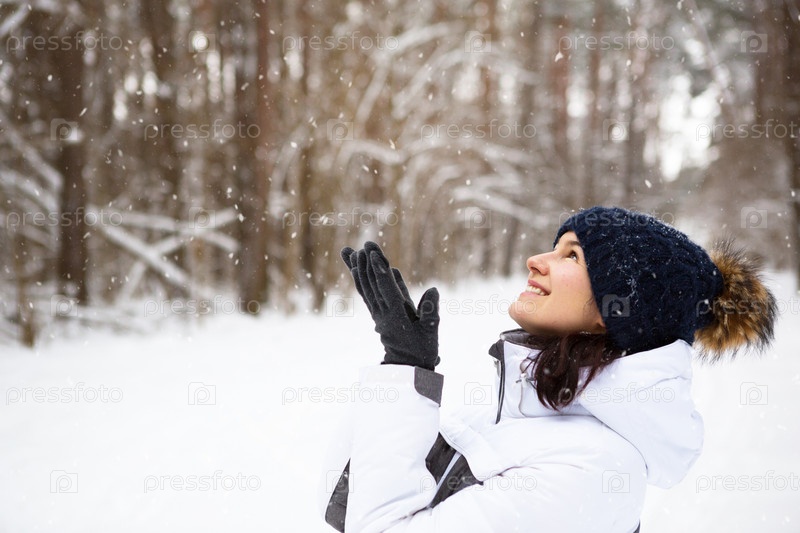 Женщина в теплой вязаной шапке, надвинутой на глаза, улыбается и наслаждается снегом, холодной погодой. Мероприятия на свежем воздухе, сезон, зима, таяние снега. Покрытый инеем, красивая улыбка. Портрет крупным планом