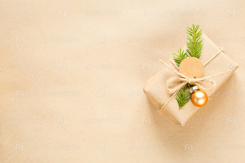 Подарочная коробка к Рождеству и Новому году из экологически чистых материалов: крафт-бумага, живые еловые ветки, шишки, шпагат. Теги с макетом, натуральный декор, ручная работа, сделай сам. Плоско, фон, рамка, Минимализм