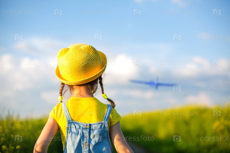 Девушка в желтой шляпе запускает в поле игрушечный самолет, смотрит на след. Летняя пора, детство, мечты и беззаботность. Авиатур от турфирмы о путешествии, приключениях и отдыхе