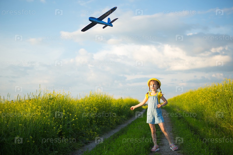 Девушка в желтой панаме запускает в поле игрушечный самолет. Летняя пора, детство, мечты и беззаботность. Авиатур от турфирмы о путешествии, приключениях и отдыхе. Деревня, коттеджный поселок