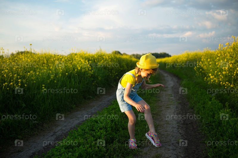 Девушка в поле убивает комаров, которые кусают ее руки и ноги. Ребенок шлепает себя по телу, защита от укусов насекомых, репеллент безопасен для детей. Отдых на природе, против аллергии