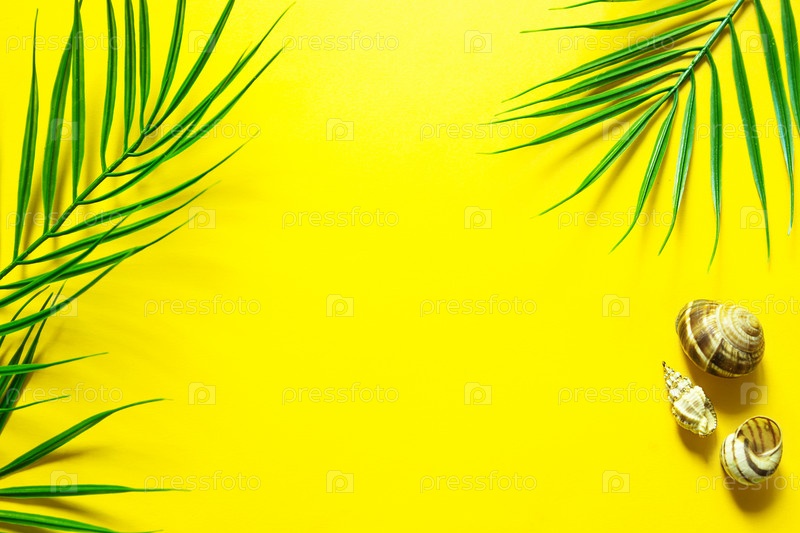 Желтый летний фон с пальмовыми листьями - тема пляжа, тропического отдыха, жаркого солнца. Рамка, пространство для копирования