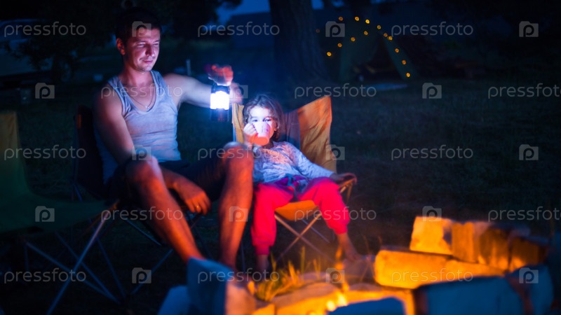 Папа и дочь сидят ночью у костра на открытом воздухе летом на природе. Семейный поход, посиделки у костра. День отца, барбекю. Кемпинговый фонарь и палатка