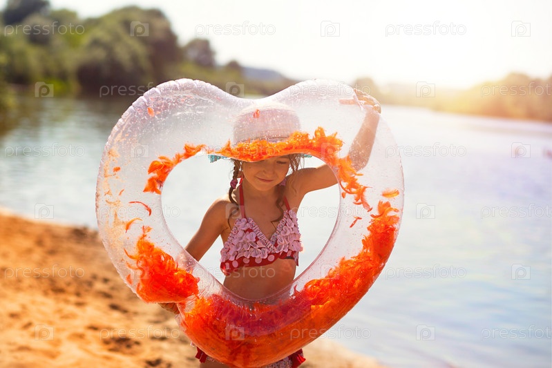 Девушка в шляпе стоит на берегу реки с прозрачным надувным кругом в форме сердца с оранжевыми перьями внутри. Пляжный отдых, плавание, солярий, солнцезащитные средства