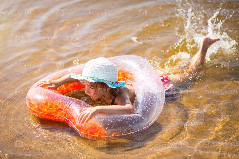 Девушка в шляпе плавает в реке с прозрачным надувным кругом в форме сердца с оранжевыми перьями внутри. Море с песчаным дном. Пляжный отдых, плавание, солярий, солнцезащитные средства