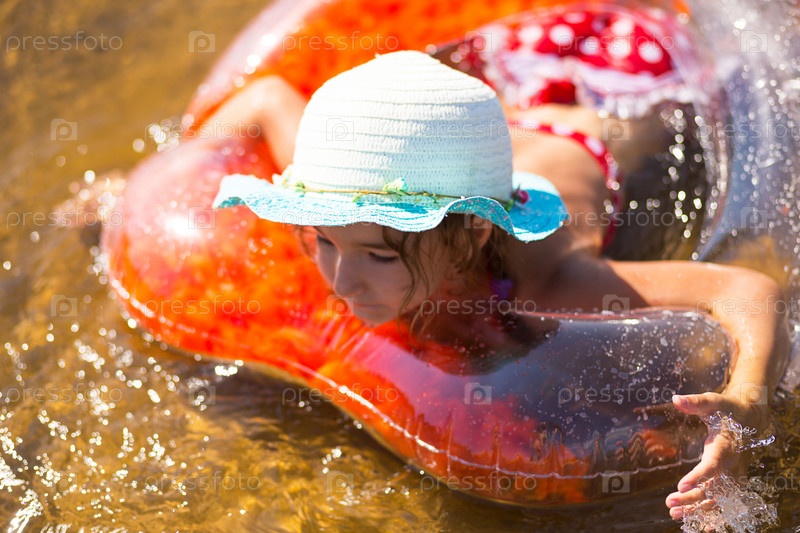 Девушка в шляпе плавает в реке с прозрачным надувным кругом в форме сердца с оранжевыми перьями внутри. Море с песчаным дном. Пляжный отдых, плавание, солярий, солнцезащитные средства