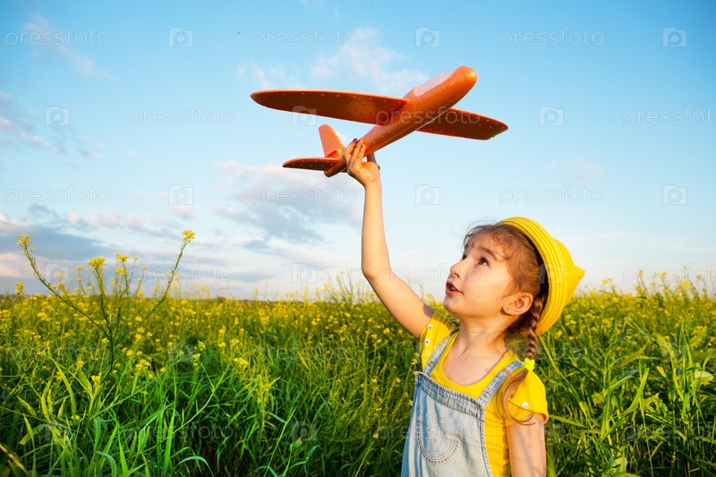 Девушка в желтой панаме запускает в поле игрушечный самолет. Летняя пора, счастливое детство, мечты и беззаботность. Авиатур от турфирмы на путешествие, полет, приключение и отдых