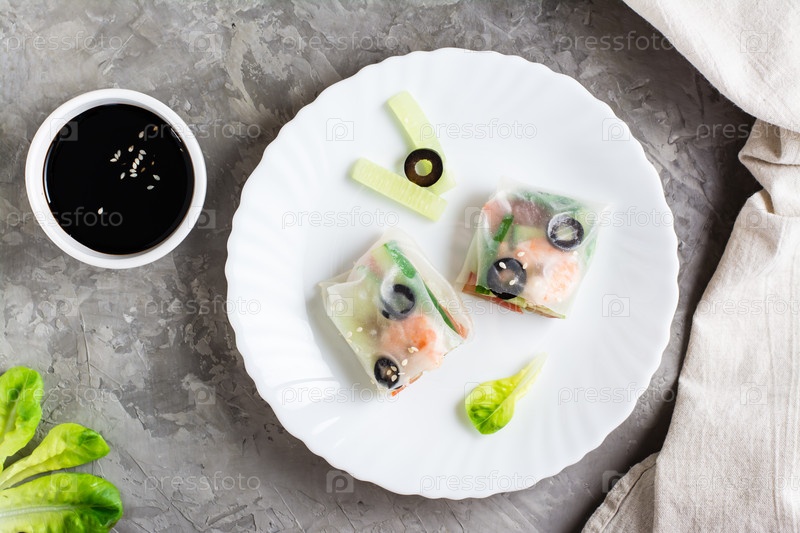Разрезанный пополам спринг-ролл в рисовой бумаге с морепродуктами и овощами на тарелке. Вид сверху. Крупный план