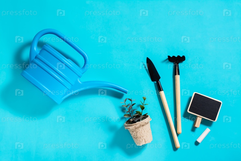 Ростки в горшке, лейка и садовый инвентарь на синем фоне. Концепция домашнего садоводства