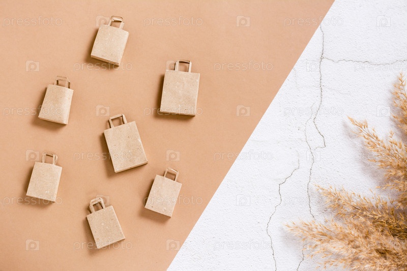 Бумажные сумки для покупок на двухцветном фоне. Устойчивый образ жизни. Вид сверху