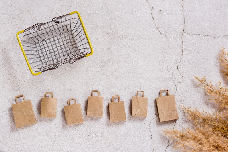 Сумки из крафт-бумаги подряд и корзина на бетонном фоне. Вид сверху