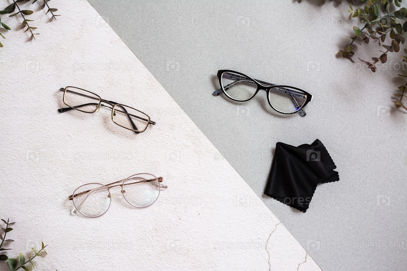 Несколько видов очков и салфетка на двухцветном фоне