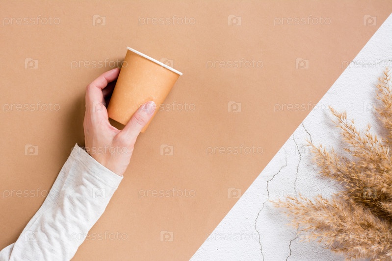 Женская рука держит одноразовую картонную чашку для напитков на двухцветном фоне. Экологичный шаблон. Вид сверху