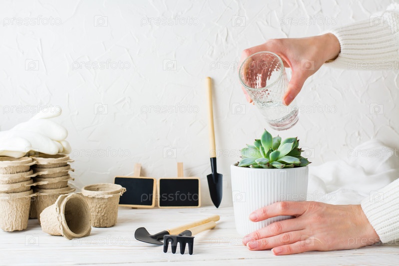 Женские руки поливают суккулент в горшке и инструменты для пересадки растений