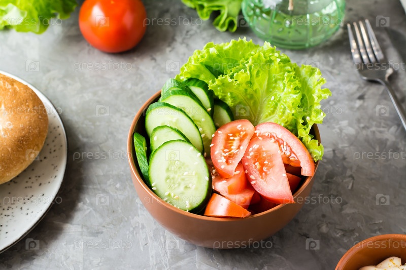 Чаша из свежих овощей с огурцом, помидором и салатом на столе дома. Крупный план