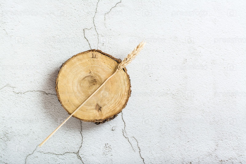 Ухо на срезанном дереве на сером фоне. Вид сверху. Экологичный шаблон
